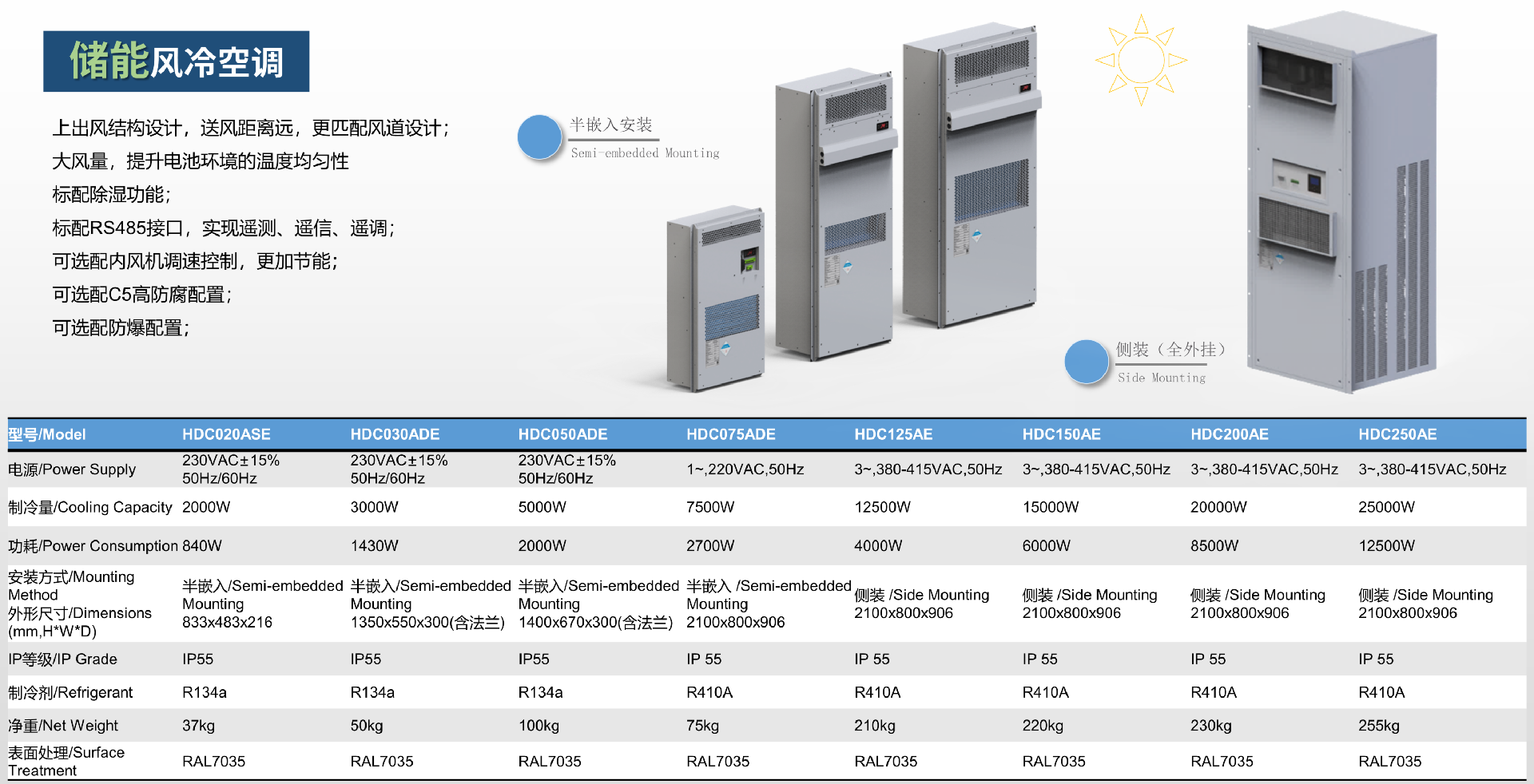 上出风结构设计,送风距离远,更匹配风道设计;大风量,提升电池环境的温度均匀性标配除湿功能;标配RS485接口,实现遥测、遥信、遥调;可选配内风机调速控制,更加节能;可选配C5高防腐配置;可选配防爆配置;型号/ModelHDC020ASEHDC030ADEHDC050ADEHDC075ADEHDC125AEHDC150AEHDC200AEHDC250AE电源/Power Supply230